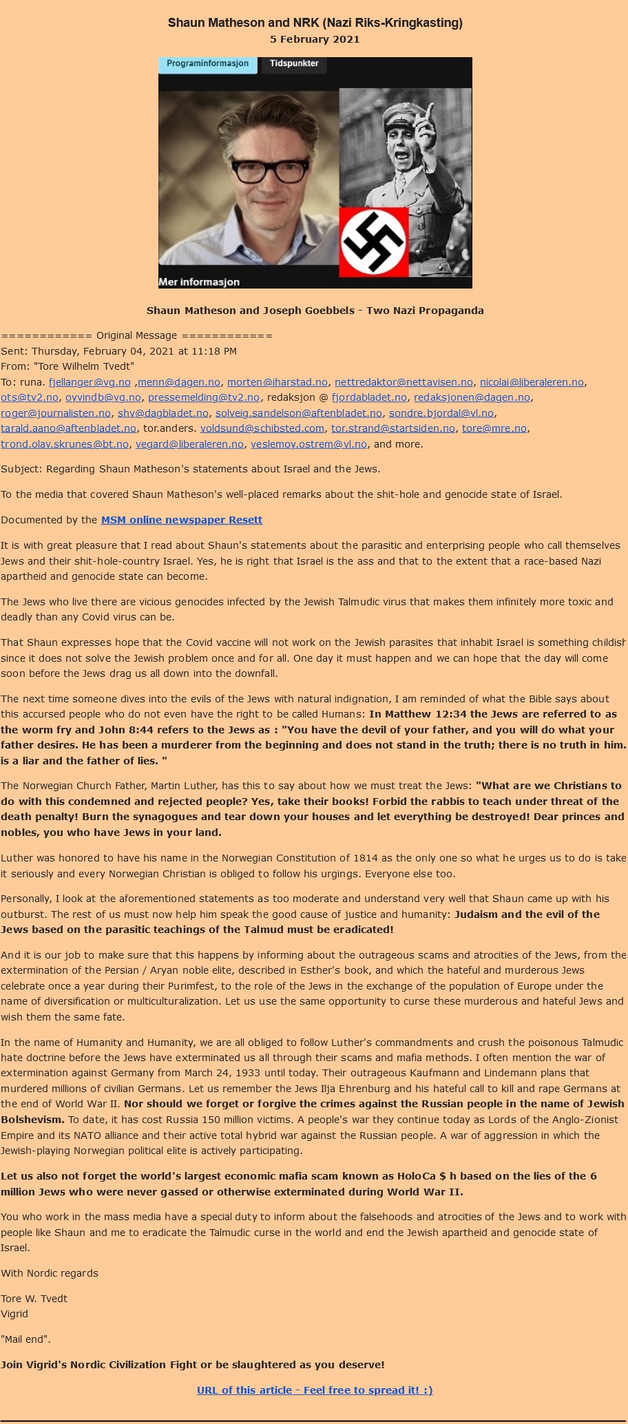 “Norway's neo-Nazi movement, Vigrid, should be banned as an example that incitement to hate is not freedom of expression!”